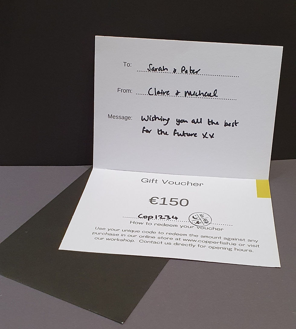 Looking for the perfect gift but can't decide what to pick? Give the gift of a voucher and let someone pick the perfect piece either from our online shop or our studio. Vouchers are available in various denominations. If you need something for a specific amount please contact us directly.